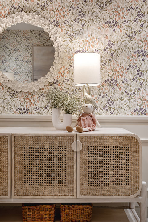 Un dormitorio de bebé diseñada para encantar con cada detalle. Las paredes están vestidas con un papel tapiz de delicadas flores en tonos pastel, que aportan una sensación de frescura y alegría. Los muebles de líneas suaves y elegantes, complementan perfectamente el ambiente, aportando calidez y naturalidad al espacio.
